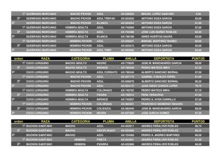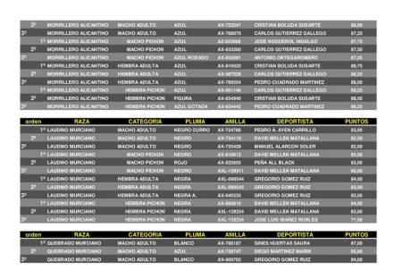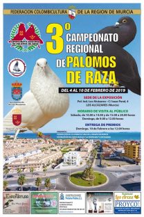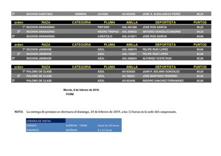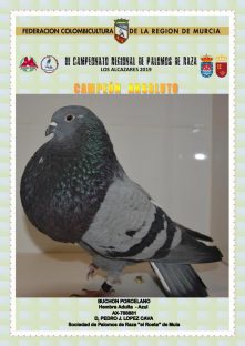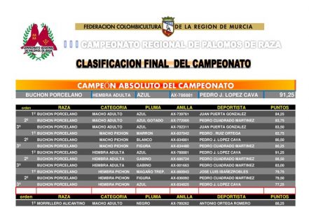Noticias Relacionadas15º CAMPEONATO COPA REGIÓN DE MURCIA DE PALOMOS DEPORTIVOS – CEUTI 202525 abril, 202572º CAMPEONATO REGIONAL DE PALOMOS DEPORTIVOS – LOS VALIENTES 20257 abril, 202523/02/2025. Final CAMPEONATO REGIONAL DE PALOMOS DE RAZA – LORCA 2025.4 marzo, 2025Protocolo Emergencia Gripe Aviar11 febrero, 20258º CAMPEONATO REGIONAL DE PALOMOS DE RAZA 2025 – PURIAS (LORCA)27 enero, 2025RELACION CAMPEONATOS OFICIALES 2025.7 enero, 2025